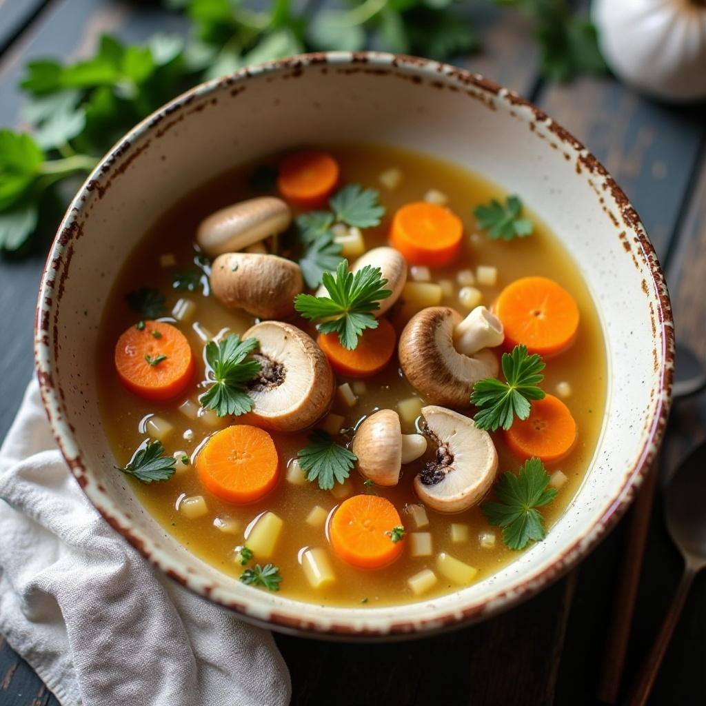 Esta versión de SilliSuppe es baja en grasa gracias a la sustitución del caldo de carne por uno de verduras, manteniendo los beneficios nutricionales de las setas. Las verduras añadidas proporcionan una fuente adicional de fibra y antioxidantes, mientras que el caldo realza la digestión. Para una opción más ligera, puedes reducir la cantidad de mantequilla o usar un aceite de oliva.