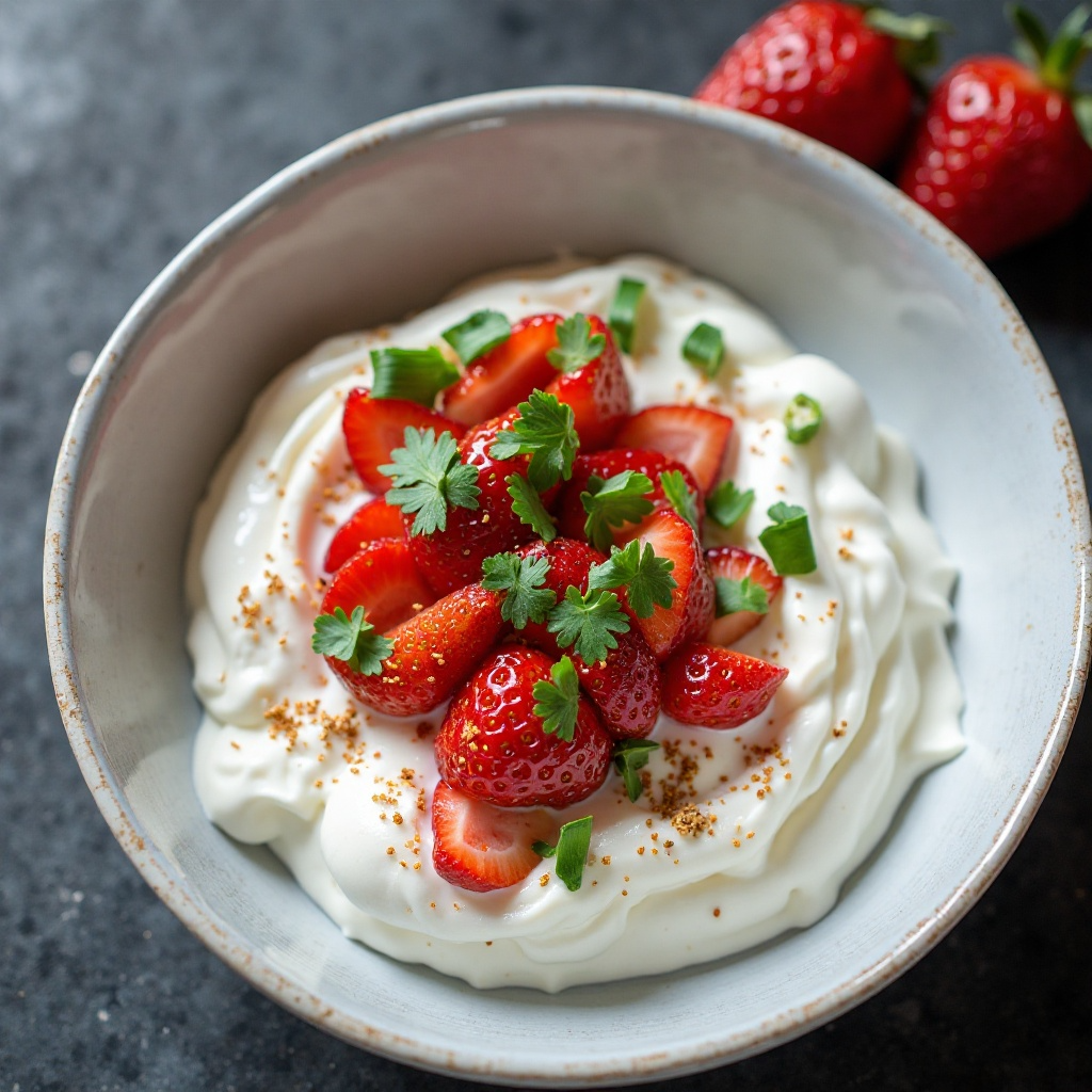 3. Coloca la mezcla de skyr en un plato hondo y adorna con las fresas en rodajas y una capa generosa del cilantro picado si lo deseas.