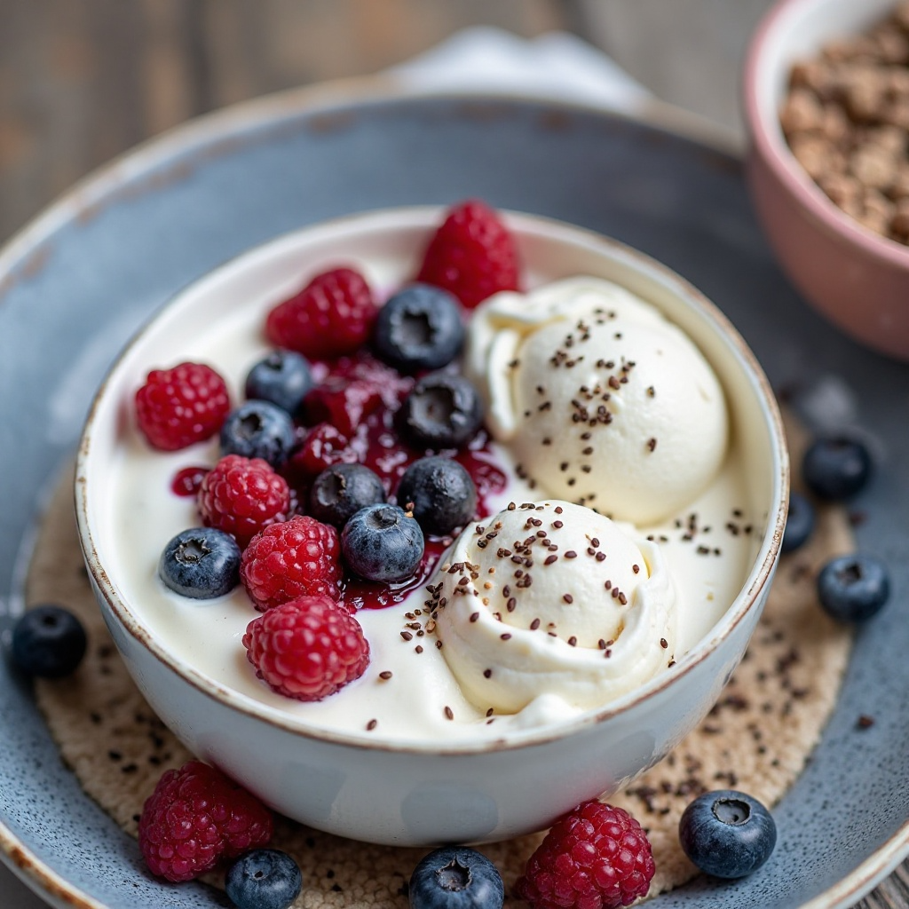 El skyr es una opción rica en proteínas y bajo en grasa, perfecto para dietas altas en proteínas o para mantener la saciedad. Las frutas frescas y la mermelada de arándanos aportan vitaminas, antioxidantes y fibra, mientras que las semillas de chía pueden aumentar los beneficios nutricionales con su contenido de omega-3, ácidos grasos esenciales y fibra soluble.