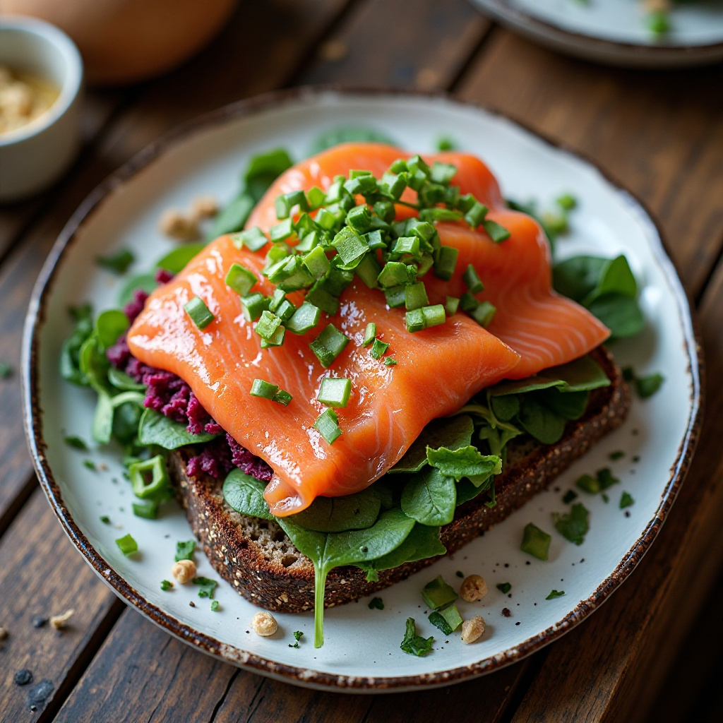 El salmón es una fuente rica en omega-3, conocida por sus beneficios para la salud cardiovascular. El pan rugoso aporta fibra y nutrientes esenciales. Los toppings como el pepino y las espinacas son bajos en calorías y altos en vitaminas y minerales, lo que hace de esta receta una opción saludable y deliciosa.