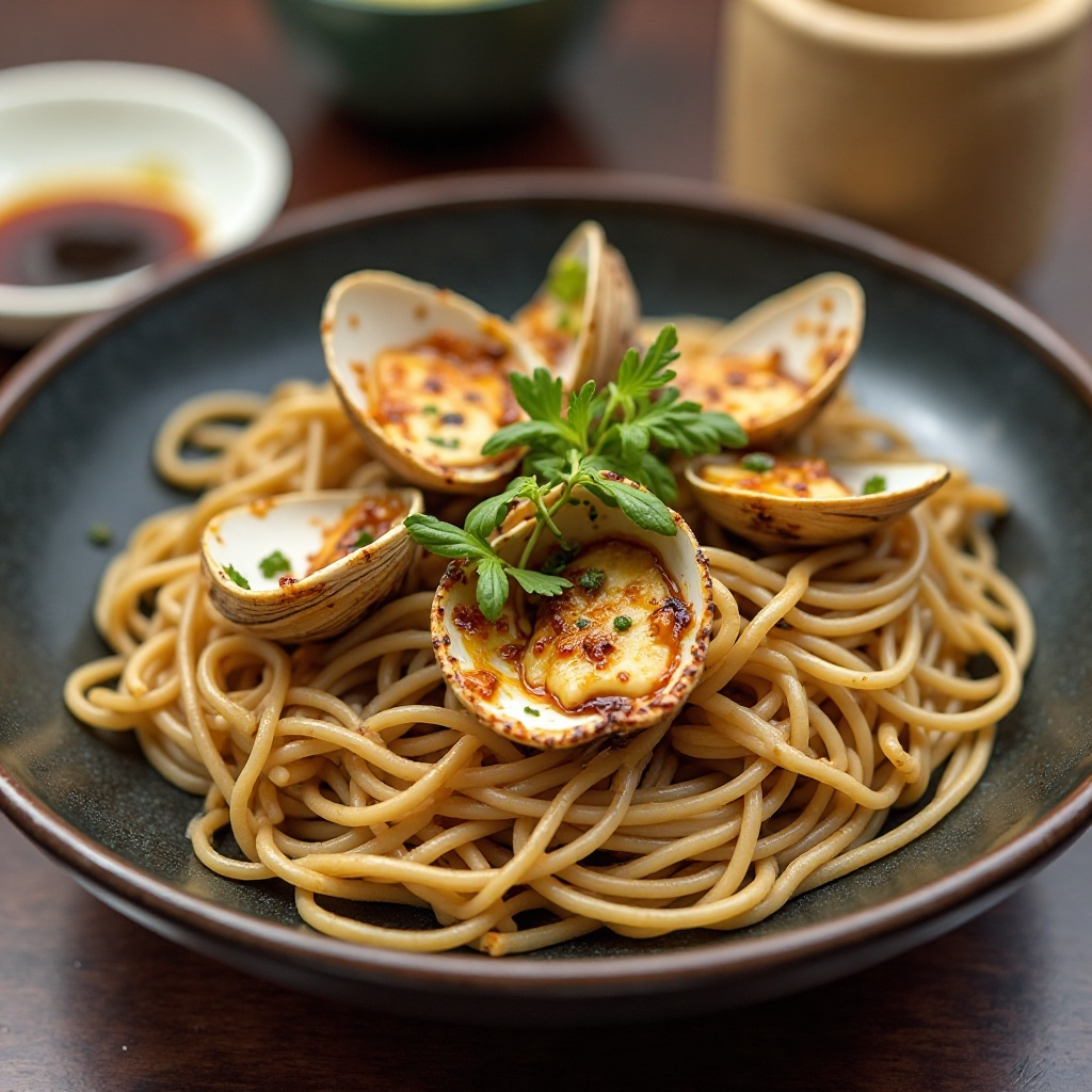 Matsue, una ciudad en la prefectura de Shimane, Japón, es famosa por su relación con los shijimi clams. Este plato de pasta de soba con estos mariscos ofrece un sabor único y refrescante. La soba, un tipo de pasta de trigo integral, es servida con shijimi clams cocinados a la parrilla o a la plancha, y aderezados con una salsa suave que realza su natural sabor marino.