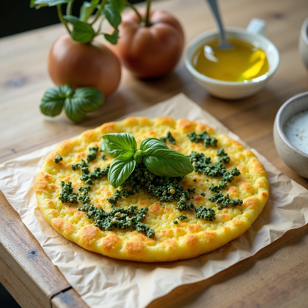 La socca es un plato típico de Niza, en Francia, que se caracteriza por su textura crujiente y su sabor ligero. Es una especie de crepe hecho principalmente con harina de garbanzos, agua y aceite de oliva. En esta receta, la socca se complementa con pesto genovese, lo que le da un toque italiano y aumenta su sabor sin ser demasiado pesado.