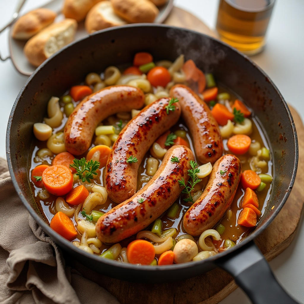 - Agrega las salchichas a la sartén y cocina a fuego medio, girándolas ocasionalmente, hasta que estén doradas y cocidas por dentro, aproximadamente 10 minutos.