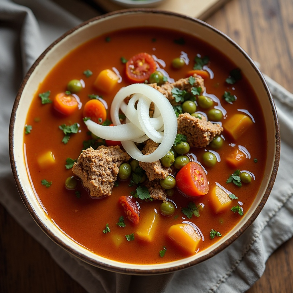 8. Sirve caliente, decorando con cebolla en rodajas y una hoja de laurel si lo deseas. Agrega más especias al gusto antes de servir.