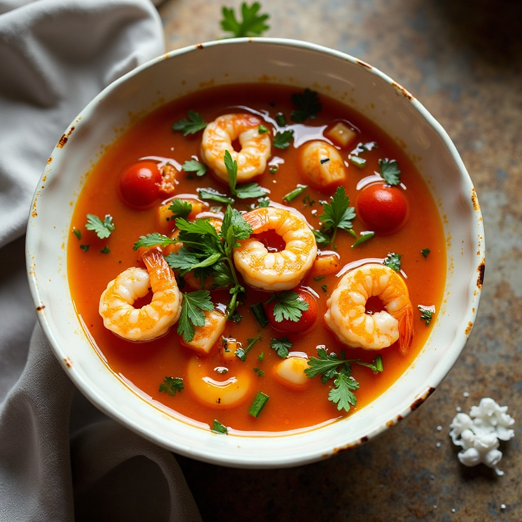 - Agrega el caldo de mariscos, sal y pimienta. Lleva a ebullición y luego reduce el fuego a medio-bajo, cocinando a fuego lento hasta que los camarones estén tiernos, aproximadamente 5-7 minutos.