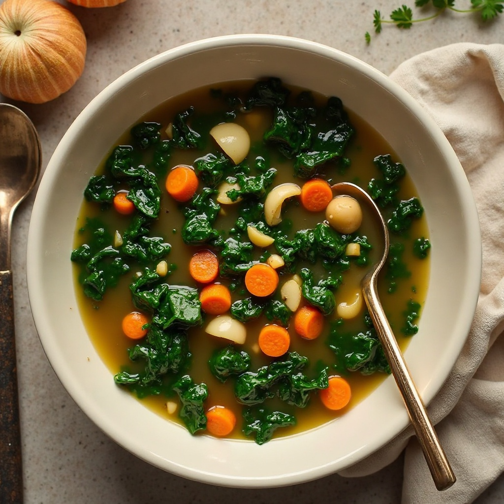 La col verde es rica en fibra y vitaminas A, C y K, lo que contribuye a una dieta saludable. La adición de especias de curry puede aportar beneficios adicionales debido a su contenido de antioxidantes. Este plato es una alternativa ligera a las sopas tradicionales, perfecta para aquellos que buscan una opción vegetariana o vegana.