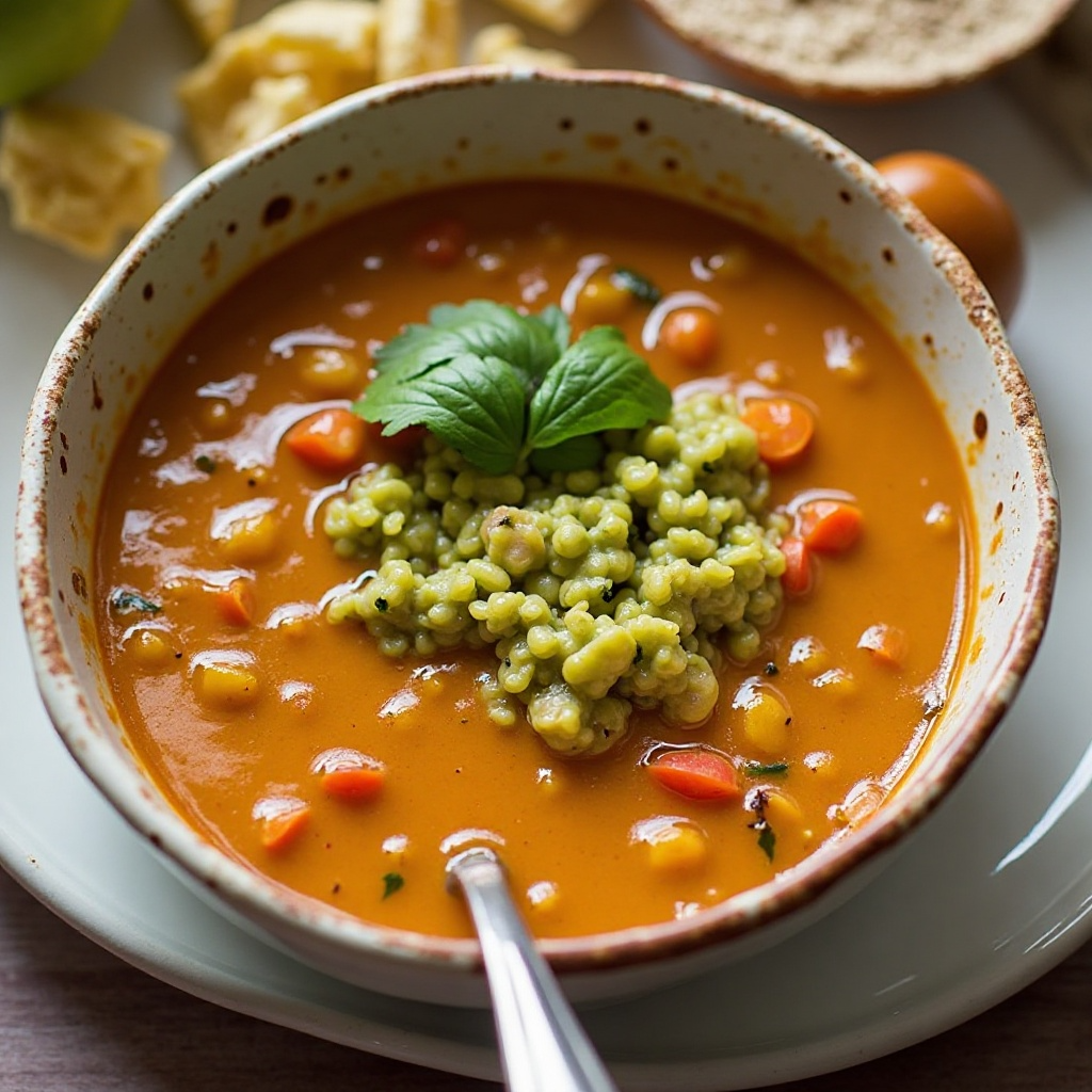 La región de Sacatepéquez en Guatemala es conocida por su rica gastronomía, que incluye platos con guacamol, una salsa espesa y cremosa hecha a partir de tomates y ajíes verdes. Esta sopa es una interpretación única de los sabores locales, ideal para un almuerzo reconfortante.