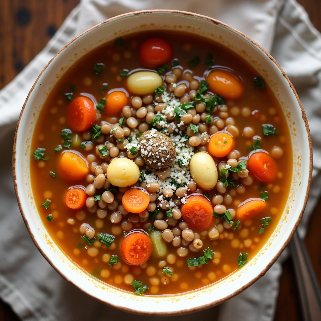 Norcia, una región histórica y gastronómica de Italia, es famosa por sus lácteos, en particular el queso Pecorino. Aunque no directamente relacionado con las lentejas, su cocina valora ingredientes simples y locales, como las verduras y la carne de cerdo típica de la zona. La Sopa de Lentejas de Castelluccio refleja esa filosofía culinaria, celebrando los sabores de la tierra con un toque de calidez y sencillez italiana.
