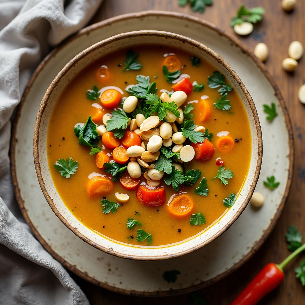 Richmond, Virginia, es conocida por su rica tradición culinaria, que a menudo incorpora productos locales. Este plato refleja la capacidad de innovar con ingredientes disponibles, adaptando recetas clásicas para satisfacer preferencias modernas y restricciones dietéticas. El uso del maní en Richmond no solo se centra en platos tradicionales sino también en ofrecer alternativas saludables y sabrosas, como esta sopa ligera y reconfortante.