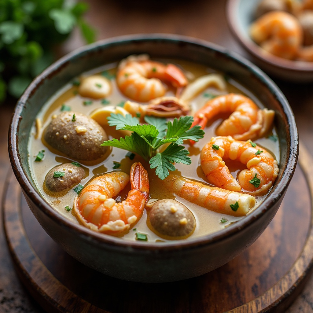La cocina de Macau es un reflejo del rico legado cultural de esta región, influenciada por China, Portugal y otros territorios. Los mariscos son una parte integral de la dieta local, y las sopas como esta ofrecen una forma vibrante y satisfactoria de disfrutarlos. En Macau, el uso de ingredientes locales como el caldo marino concentrado es clave para capturar el auténtico sabor de la bahía y su entorno costero.