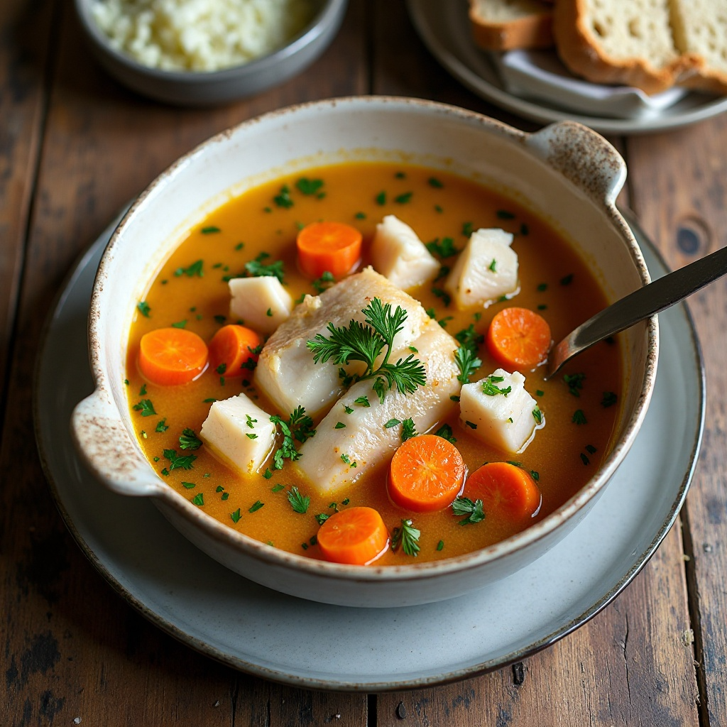 Esta sopa es rica en proteínas y vitaminas esenciales gracias a los ingredientes principales, como el pescado, las patatas y las verduras. La sal gruesa utilizada es una opción saludable para condimentar, ofreciendo sabor sin añadir excesivamente de sal a la dieta. Para adaptar la receta a restricciones dietéticas, se puede reemplazar el caldo de pescado por agua o caldo vegetal. Además, agregar más verduras como coliflor o espinacas sería beneficioso nutricionalmente.