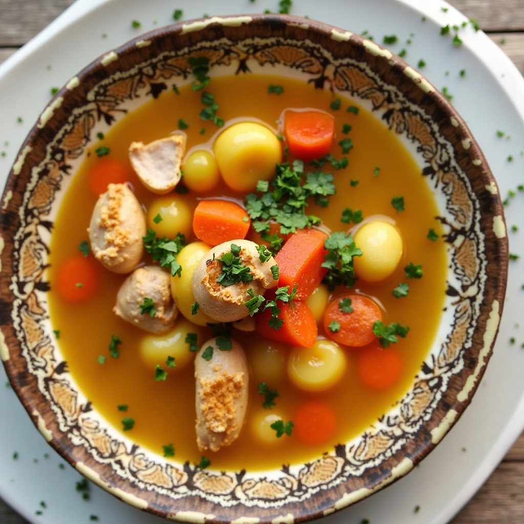 Esta sopa es rica en proteínas y vitaminas presentes en las verduras y el pollo. El vino utilizado aquí no solo enriquece el sabor sino que también aporta antioxidantes. Sin embargo, siempre se debe consumir alcohol con moderación y tener en cuenta si hay restricciones personales o dietéticas.