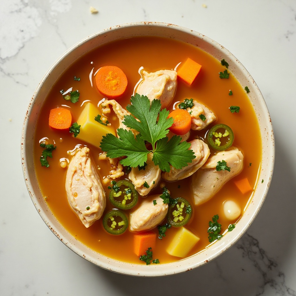 La sopa de pollo es una opción nutritiva que proporciona proteínas, vitaminas y minerales esenciales. El chile verde agrega un toque picante y beneficios adicionales, gracias a sus compuestos antioxidantes. Es importante controlar la cantidad de sal según tus necesidades dietéticas.