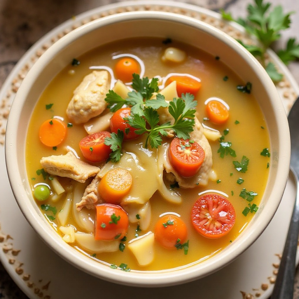Esta sopa es rica en proteínas y vitaminas gracias al pollo y las verduras. El caldo de pollo es una excelente fuente de minerales. Asegúrate de cocinar el pollo adecuadamente para reducir el riesgo de enfermedades transmitidas por alimentos. Si prefieres una versión más ligera, considera usar caldo de ave o vegetal en lugar de caldo de pollo.