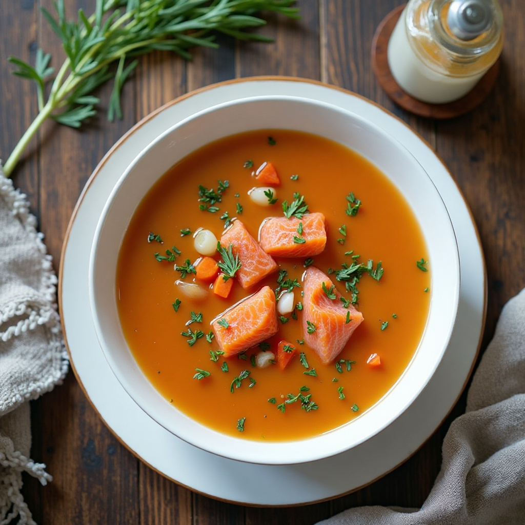 El salmón ahumado es una fuente rica de ácidos grasos omega-3, que son beneficiosos para la salud cardiovascular. La sopa, con ingredientes como el caldo de pescado y verduras de hoja verde, ofrece una excelente cantidad de minerales y antioxidantes. Para mantener la cremosidad sin aumentar las calorías, considera usar crema agria baja en grasa o leche descremada.