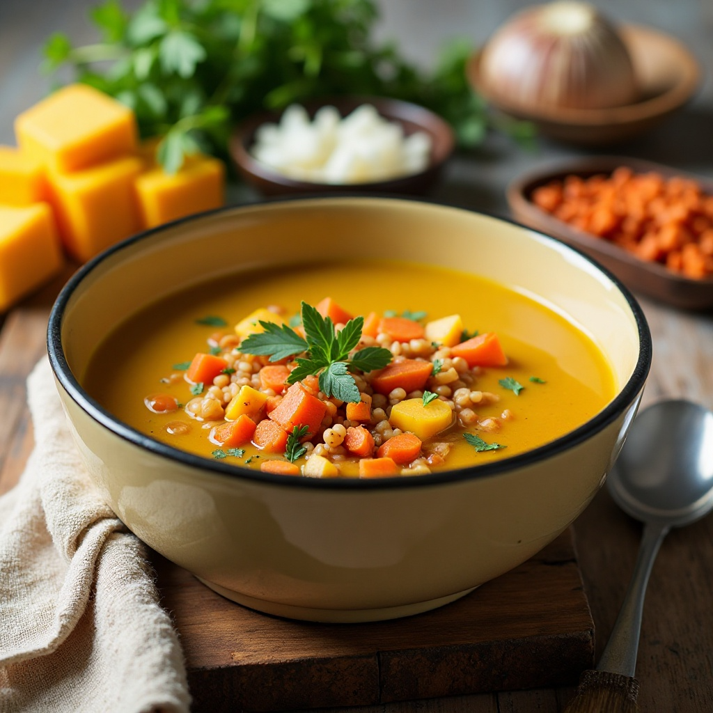 Esta sopa es rica en vitaminas y minerales esenciales gracias a los ingredientes orgánicos utilizados. La calabaza y las zanahorias son excelentes fuentes de antioxidantes, mientras que las lentejas aportan proteínas vegetales. Si se prefiere una versión vegana, se puede omitir el aceite de oliva. Es importante elegir caldo de verduras orgánico para mantener la integridad del mensaje de «comida orgánica y de granja a mesa».