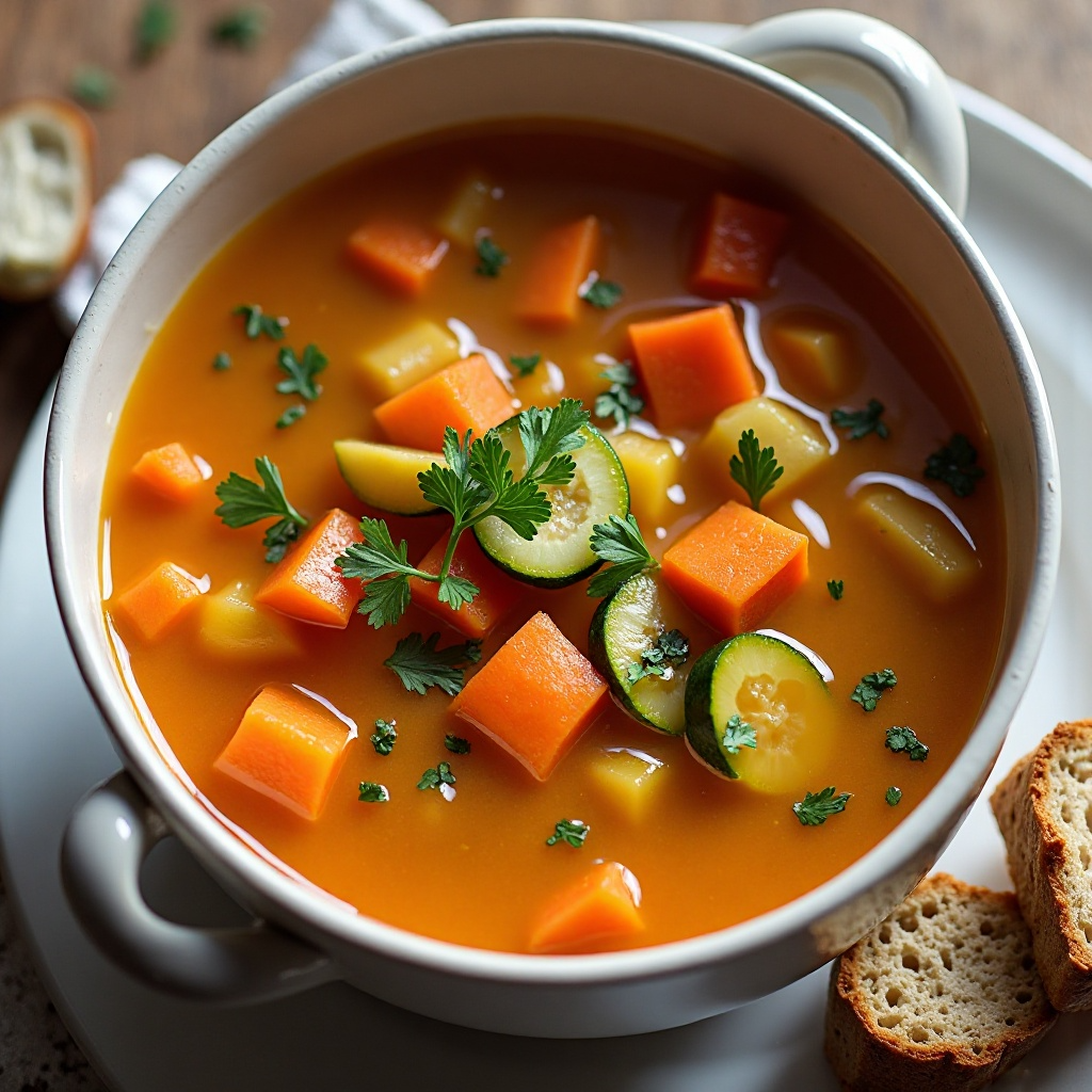 Esta sopa es rica en vitaminas A y C gracias a las zanahorias y tomates, y es una fuente saludable de fibra. El uso de caldo de verduras hecho a partir de huesos y verduras añade minerales al plato, siendo una opción deliciosa y nutritiva. Para adaptar la receta a necesidades dietéticas específicas, se puede reemplazar el aceite de oliva por aceite de oliva sin refinar o reducir la cantidad de sal según sea necesario.