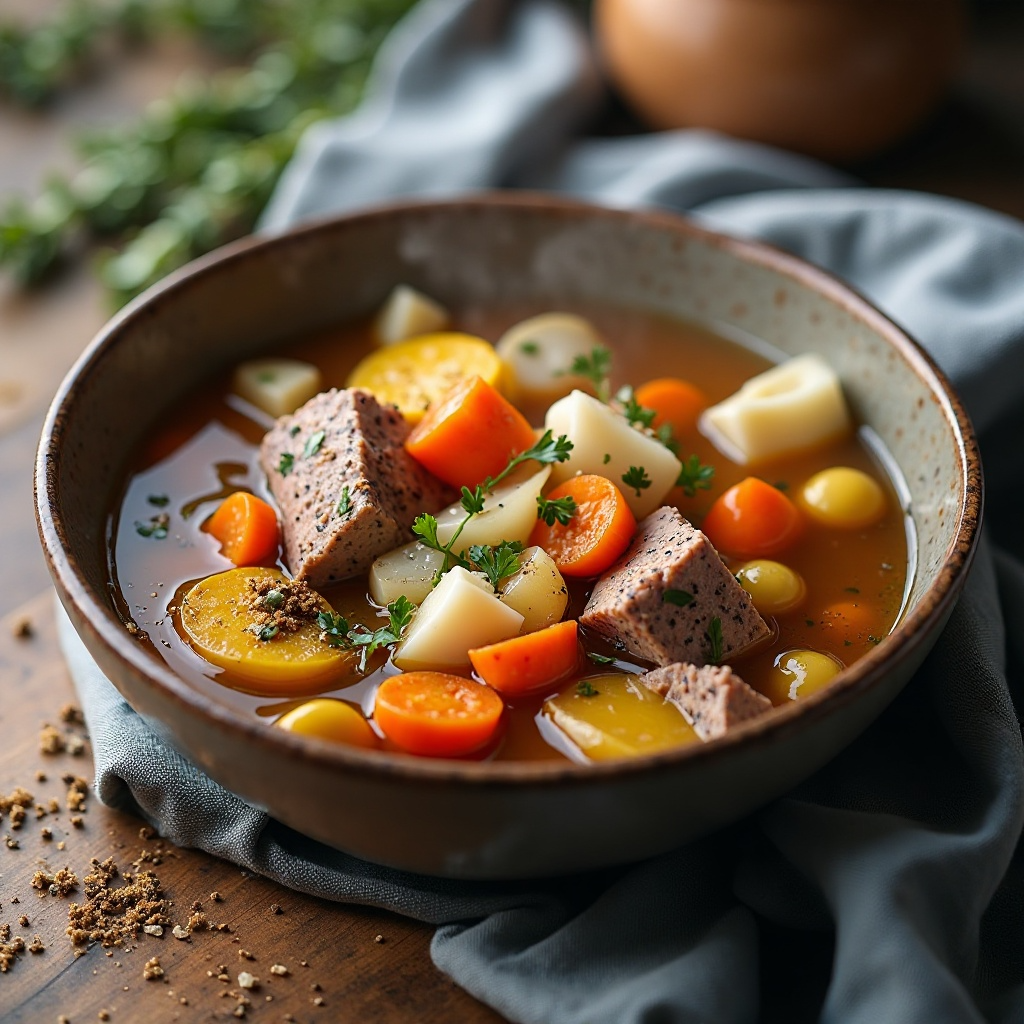 La carne de alce es baja en grasa y rica en proteínas magras. La sopa de verduras también aporta vitaminas y minerales esenciales. Para aquellos con restricciones alimenticias, asegúrate de verificar la fuente de los ingredientes utilizados. Si prefieres una versión menos calórica, puedes reducir la cantidad de aceite o usar una opción más ligera como aceite de oliva extra virgen.