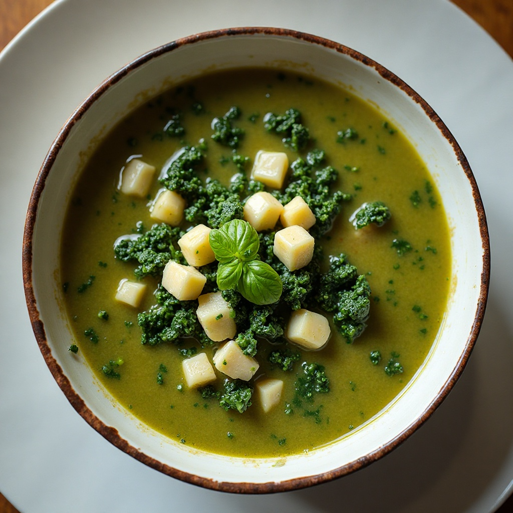 - Cuando la col esté lista, retira el bouquet garni. Agrega el pistou (la mezcla de queso y albahaca) a la olla, mezclando bien con la sopa caliente.