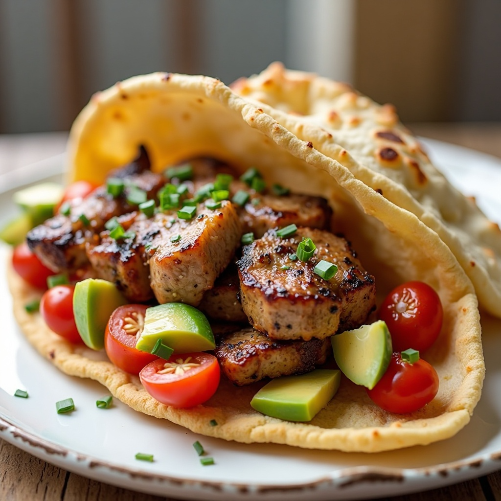 5. Monta cada pita con trozos de cerdo (o champiñones) cocido, aguacate, tomates cherry, cebolla morada y ciboulette picada.