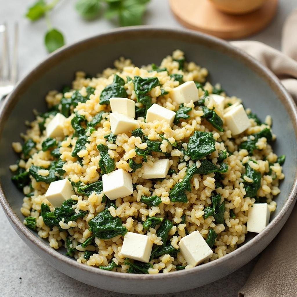 - Sirve caliente y disfruta del sabor combinado de la frescura de las espinacas con la textura cremosa del arroz y el toque salado del queso feta.