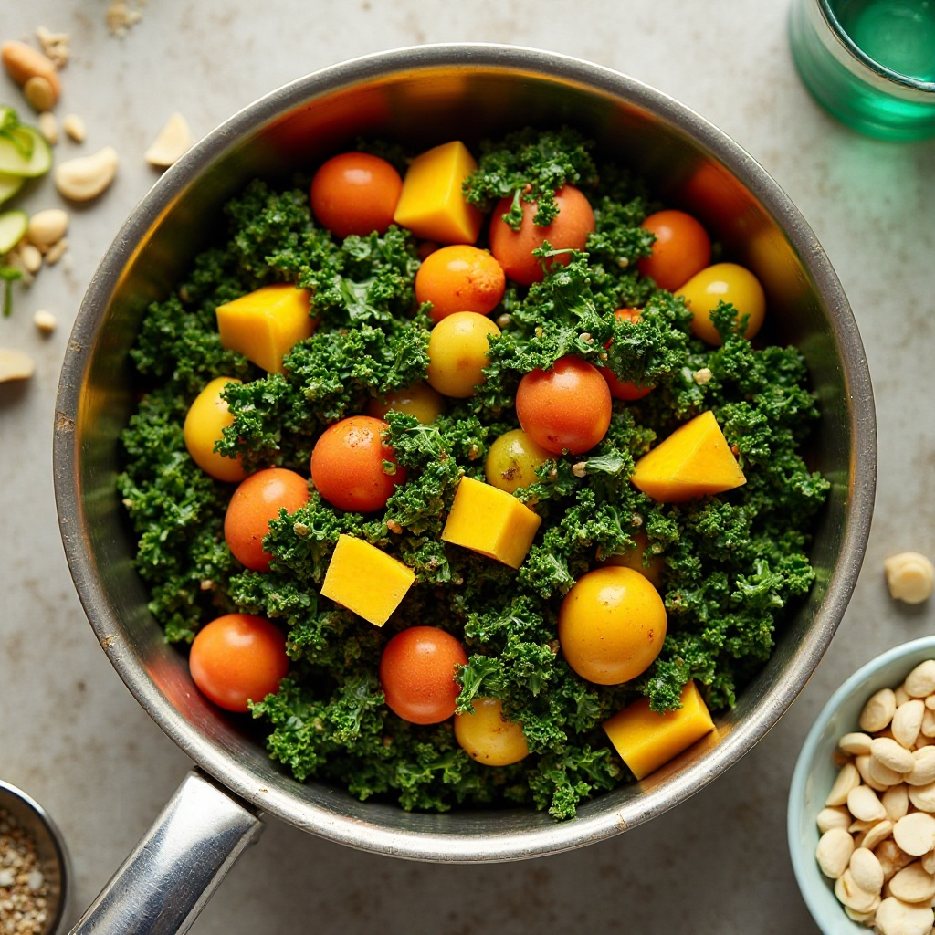 Sukuma Wiki es un plato tradicional keniano que significa «cocinar la hierba», y se refiere a un guiso verde vibrante y lleno de sabor. Originario de la región rural, esta receta presenta un toque especial con mango tropical keniano, añadiendo dulzura y una explosión de sabor fresco.