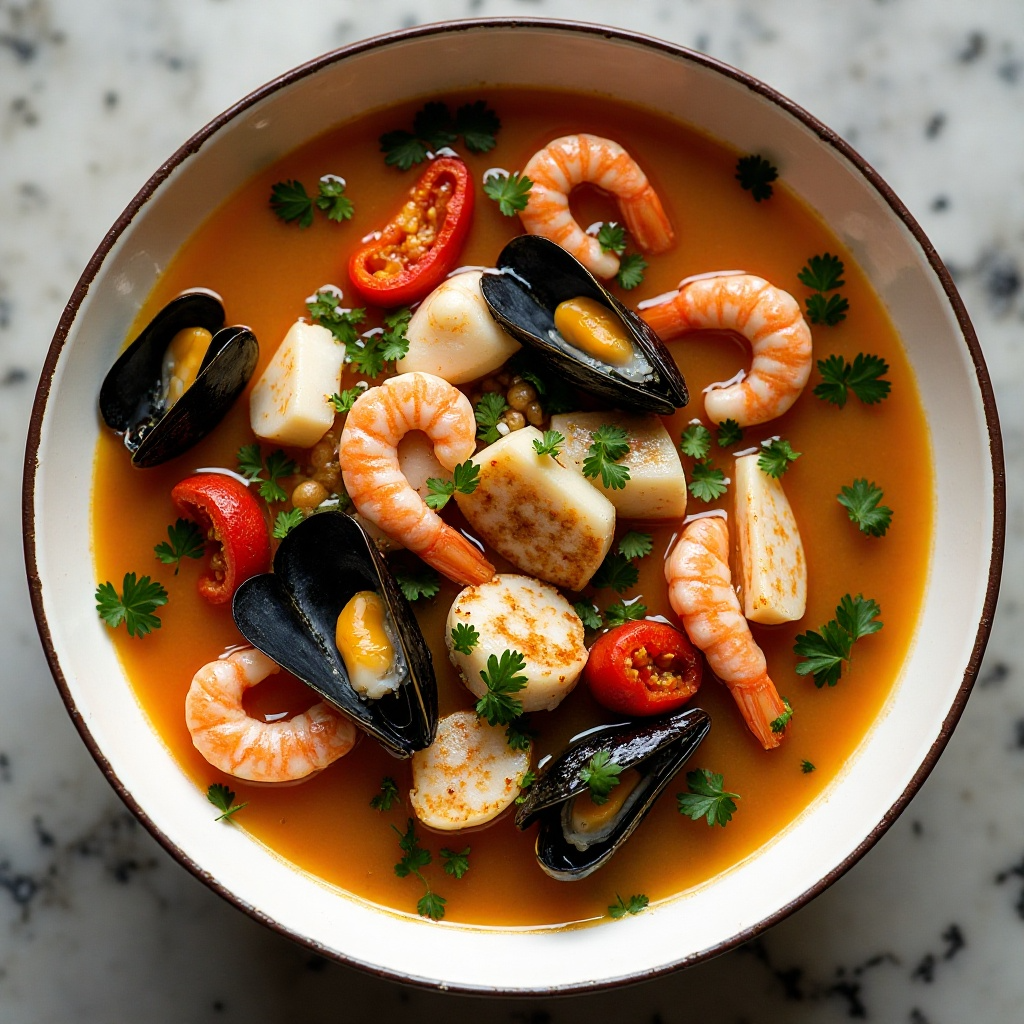 6. Una vez que el caldo esté listo, incorpora los mejillones, las gambas, los chipirones y el calamarillo. Cocina todo a fuego medio-bajo por aproximadamente 5 minutos, o hasta que los mariscos estén cocidos.
