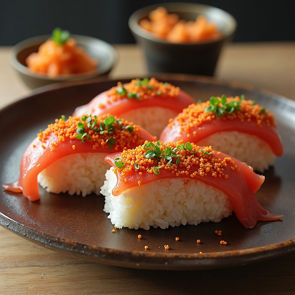Fukuoka es conocida por su fusión de tradiciones locales con influencias del resto de Japón. Esta versión de sushi utiliza mentaiko, una salsa a base de huevos de ikura (salmónido), típica de la región de Hokkaido, en Japón. El resultado es un plato lleno de sabor y textura, perfecto para aquellos que disfrutan de los sabores marinos.