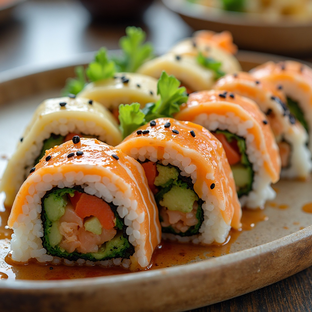 Receta de Sushi Rolls Canadienses con Salmón Rosa y Vegetales