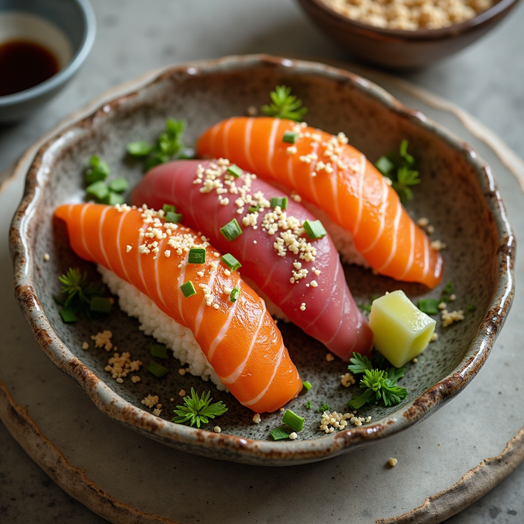 Este sushi tiene un toque distintivo de la región rusa de Vladivostok, combinando los sabores tradicionales del sushi con ingredientes locales, como el whisky de oso, que es una bebida tradicional de esta área. Se sirve con una salsa de vainilla para añadir un dulzor sorprendente y equilibrar el umami del pescado.