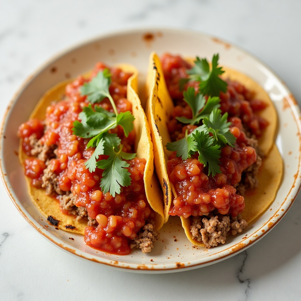 - Cubre las tortillas con salsa de tomate, asegurándote de que cubra completamente la carne y los frijoles. Añade un toque fresco de cilantro picado si lo deseas.
