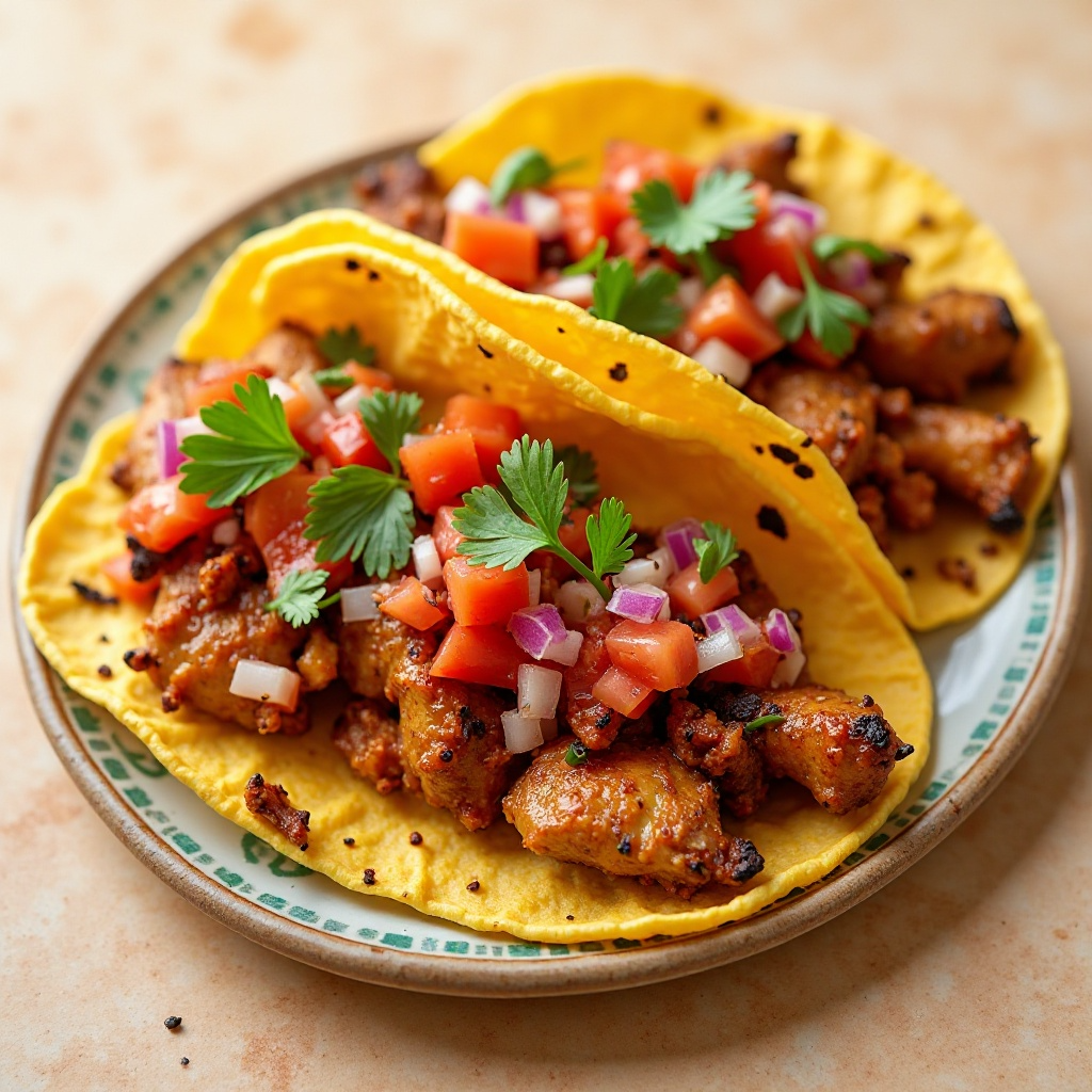 Los tacos al pastor son un clásico de la comida mexicana, originario de la zona de Tacuba en la Ciudad de México. Esta versión adaptada para Coyoacán, una vibrante delegación con raíces profundas en la cultura y la gastronomía mexicana, utiliza pollo marinado con una mezcla característica de chiles y especias, acompañados de una salsa picante y fresca. Este plato es perfecto para disfrutar en cualquier momento, aunque especialmente durante el verano.