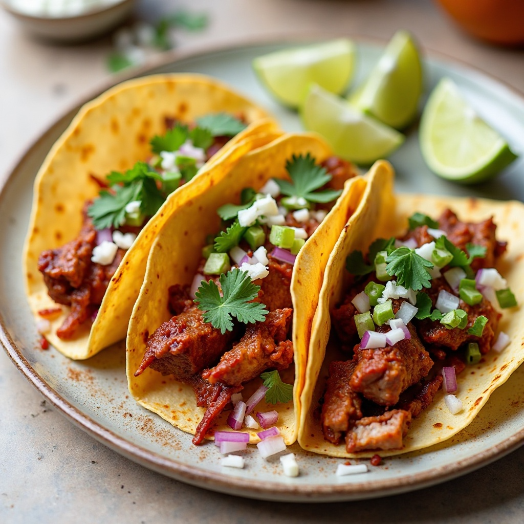 - Prepara las tortillas de harina y caliéntalas en una plancha o sartén caliente. Sirve los tacos con la carne marinada y adereza con cebolla fresca, cilantro picado y un toque de limón para realzar los sabores.