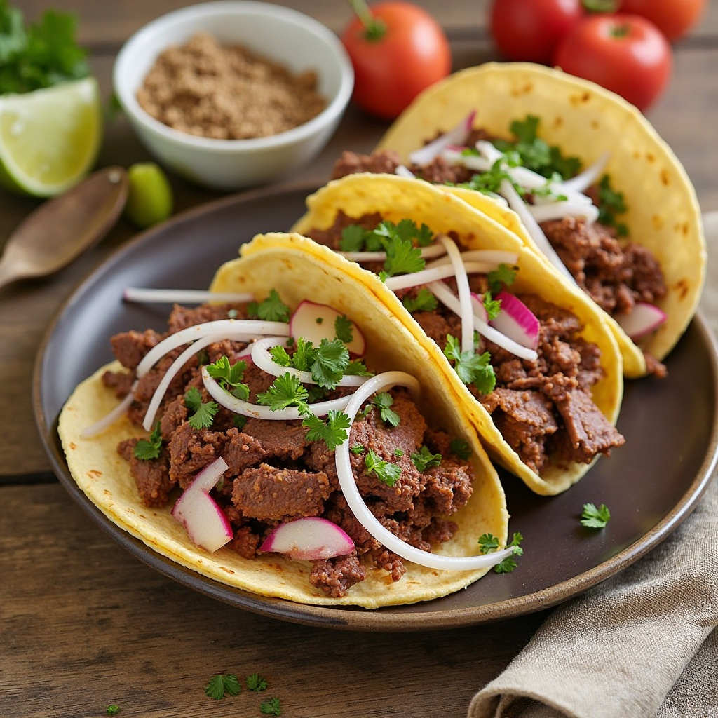 - Monta los tacos: Coloca una porción de carne de barbacoa en cada tortilla. Agrega cebolla blanca y rábanos picados, exprimido del jugo de limón y un toque de aceite si deseas una textura crujiente o simplemente mantén la carne al natural.