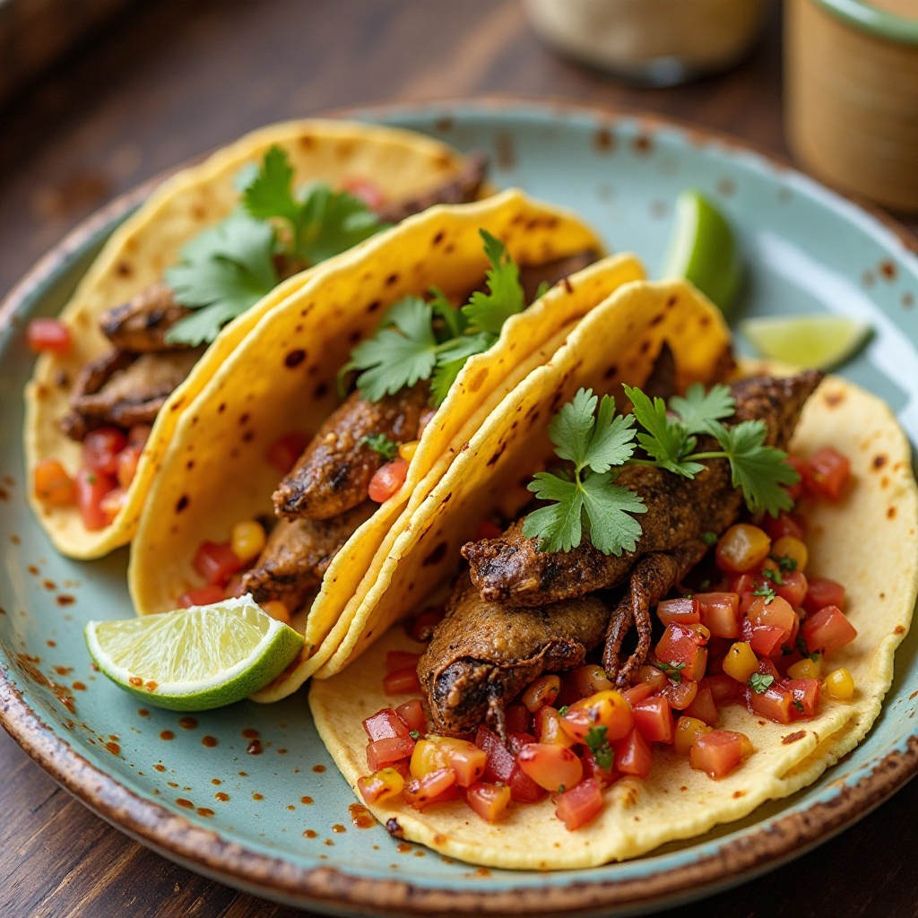 - Coloca los tacos de maíz en un plato y distribuye el relleno de chapulines con salsa entre ellos. Sirve con un poco de lima o limón fresco para añadir un toque cítrico.