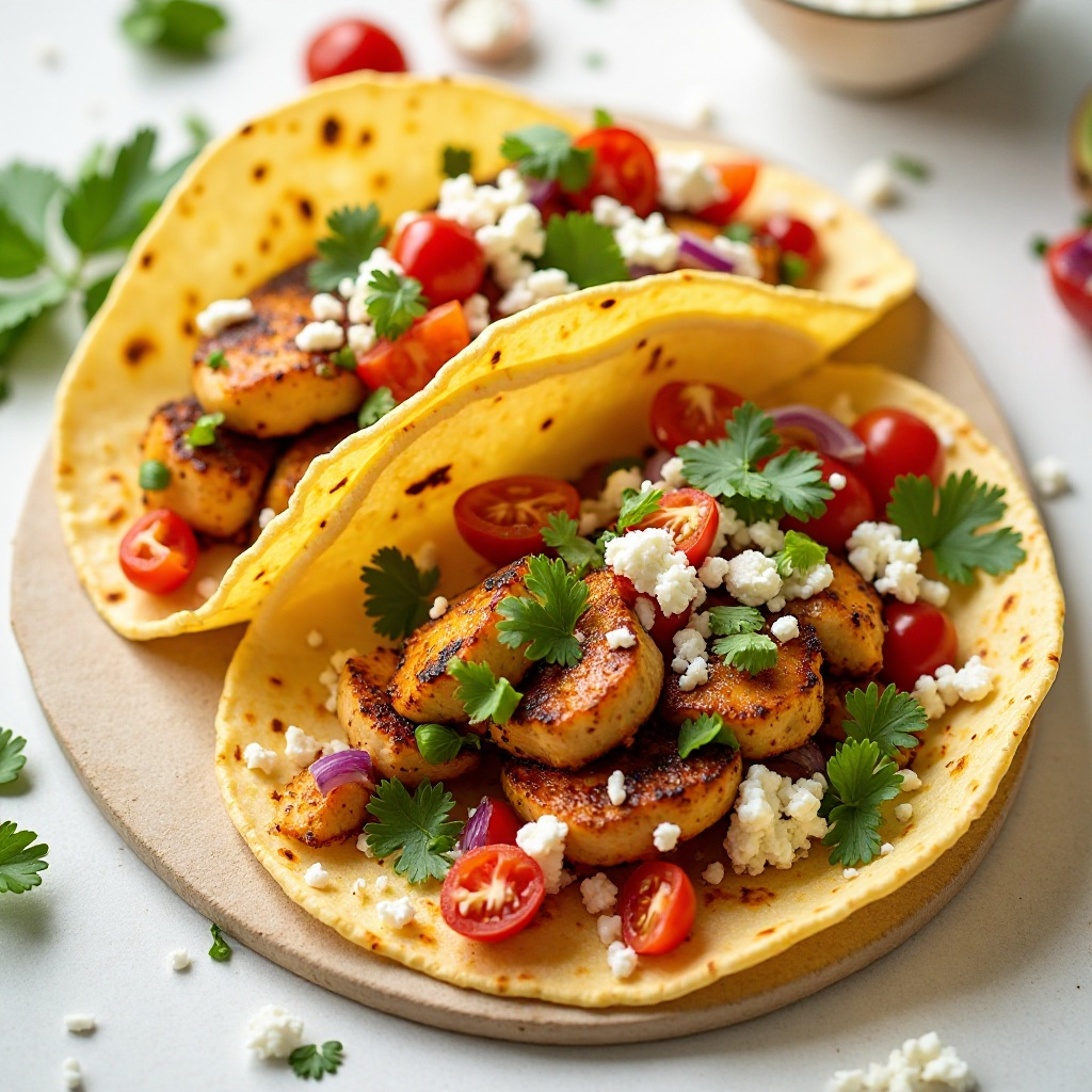 - Una vez cocida la carne, coloca las tiras de pollo sobre las tortillas. Agrega cebolla morada, pimiento verde, tomate cherry y cilantro fresco para cada taco.