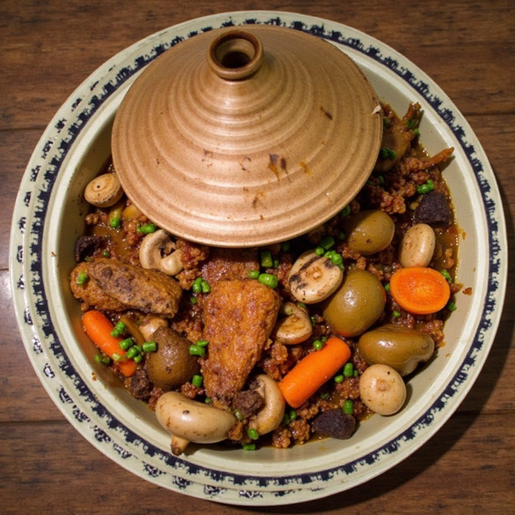 El tagine es un plato tradicional marroquí que se caracteriza por su preparación lenta en un tazón cóncavo. Para adaptarlo a ingredientes locales de Hay River, Canadá, hemos sustituido el conejo con carne de caza, un plato típico de muchas regiones rurales y de caza. Esta versión del tagine es perfecta para los fríos días canadienses, ofreciendo una rica combinación de sabores.