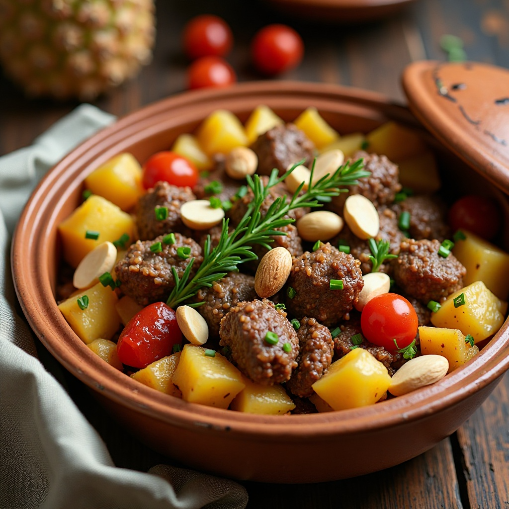 El tagine es un plato tradicional en la cocina jordana, conocido por su sabor rico y aromático. Este tagine de cordero con almendras y piña ofrece una versión ligera y refrescante del famoso plato irbideo de mansaf, combinando sabores mediterráneos con un toque dulce. Ideal para una comida sabrosa en cualquier momento del año.