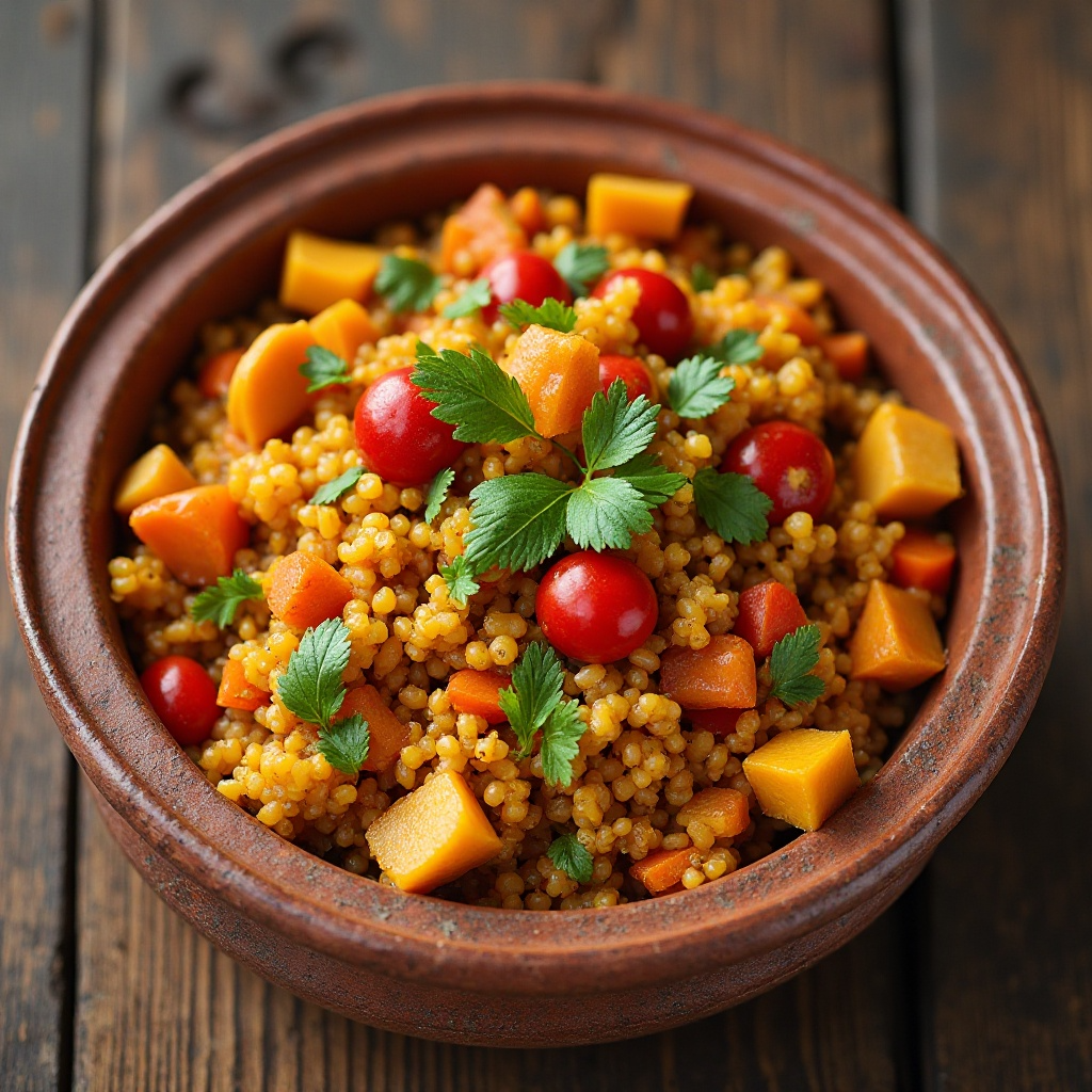 El Tagine es un plato emblemático de Marruecos que ha encontrado su camino en la cocina de Mopti, una ciudad en el sur de Mali. Esta versión utiliza los granos de Millet y Sorgo, ingredientes comunes en la región, para preparar un tagine rico en sabores africanos y lleno de nutrientes. Ideal para una cena reconfortante, este plato es fácil de adaptar a las restricciones dietéticas.
