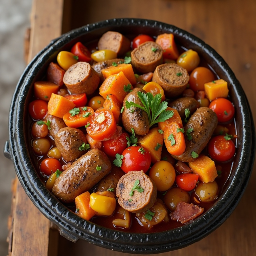 El tagine es una comida tradicional argelina que se cocina lentamente en un recipiente cónico, el mismo tajine, que también se sirve como plato. En esta versión, utilizamos carne de merguez, típica de la región norte de Argelia, para darle un toque distintivo a nuestro tagine. Es un plato abundante y delicioso, ideal para compartir en una comida familiar o una reunión con amigos.