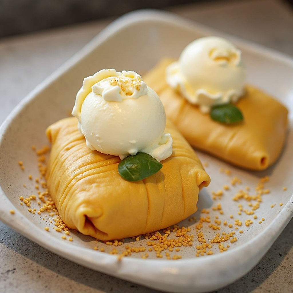 - Servir inmediatamente, disfrutando del contraste entre la masa caliente y el toque frío de las nieves, todo ello envuelto en suaves especias y queso fresco.