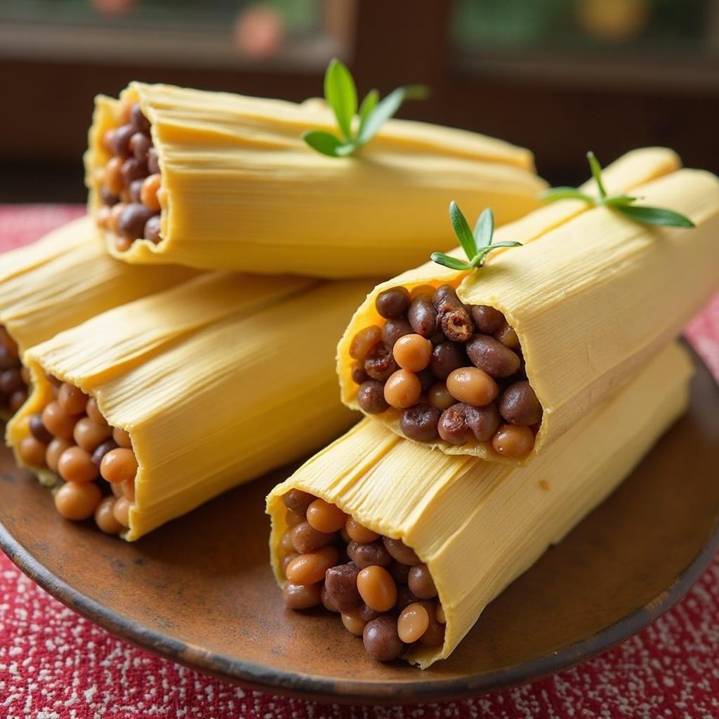 - Para cada tamal, toma una hoja de maíz y humedécela ligeramente con agua. Coloca una bola de masa en el centro, luego agrega un puñado del relleno de frijoles. Enrolla cuidadosamente la hoja alrededor del relleno para formar un paquete.