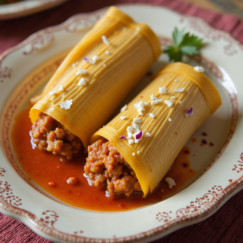 - Sirve los tamales calientes, acompañados de una salsa picante casera y decorados con juliana de cebolla roja si lo deseas.