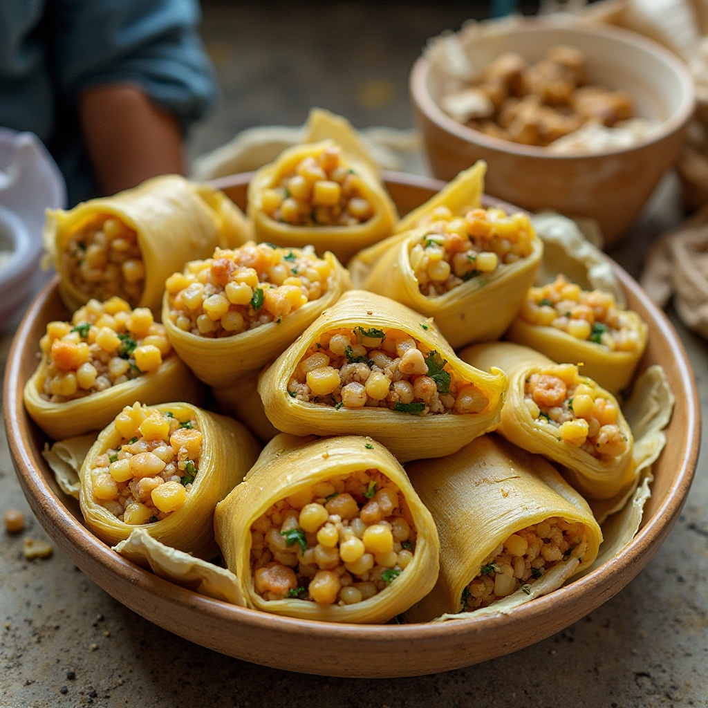 - Coloca una porción de la mezcla de masa en el centro de cada hoja de maíz, presiona para formar una base firme.