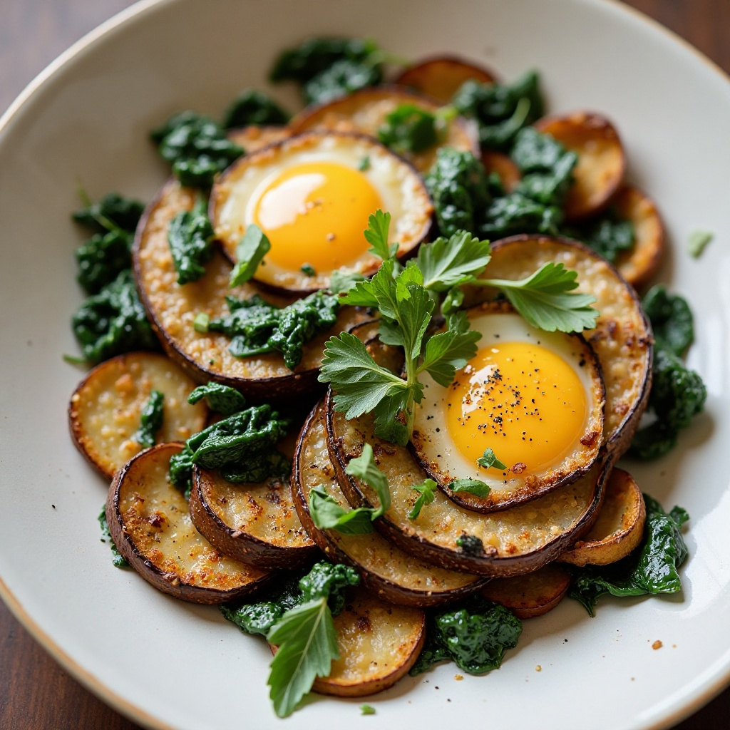 - En una sartén antiadherente, calienta el aceite. Añade las capas de berenjena alternando con las espinacas y cava, cocinando a fuego lento hasta que estén bien doradas y suaves al tacto.