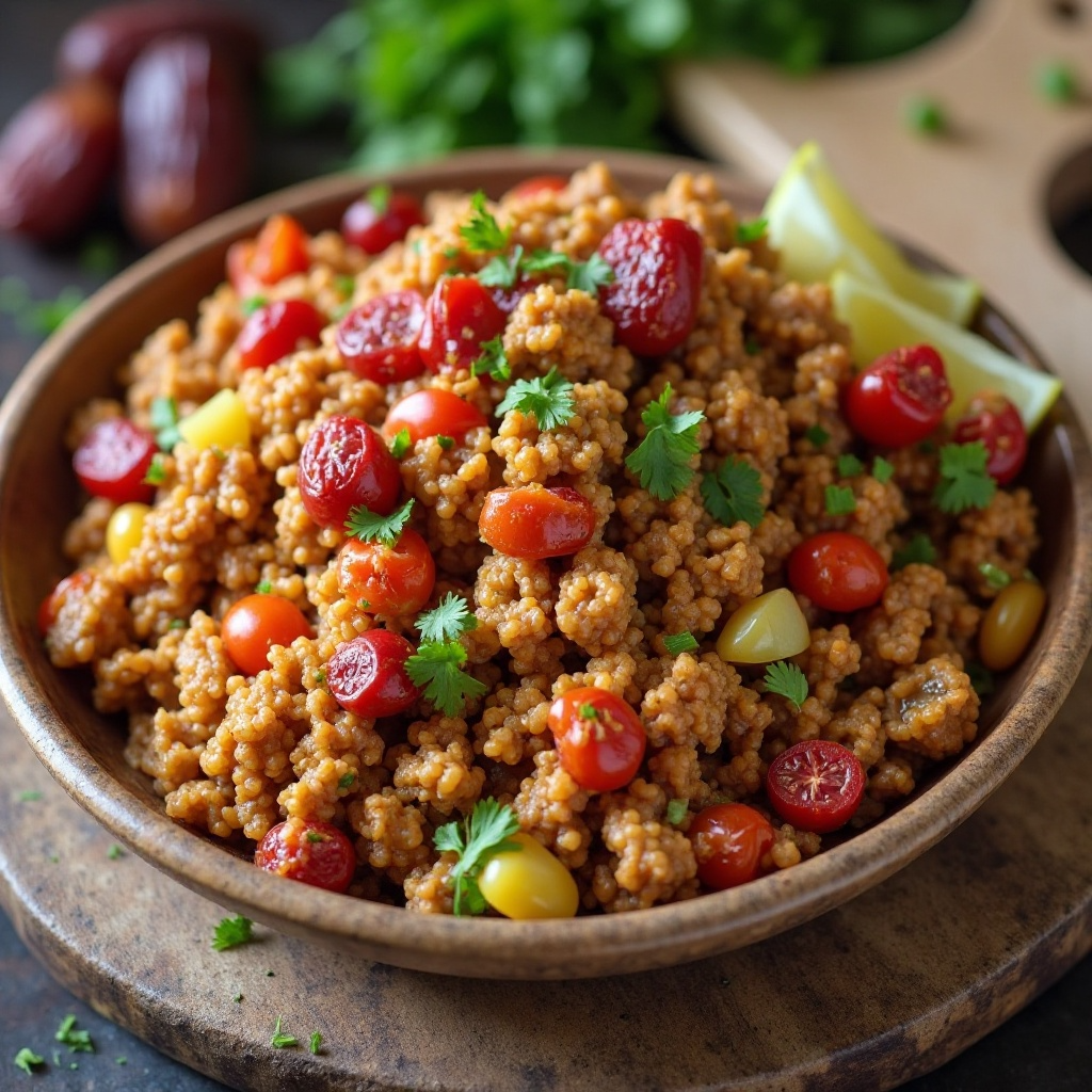 El Tarey Motawah es un plato tradicional de Arabia Saudita que combina carne picada con especias y vegetales, ofreciendo una explosión de sabores. Al incluir dátiles locales de Khobar, le añadimos un toque dulce que complementa perfectamente el equilibrio de sabores típicos de este manjar.