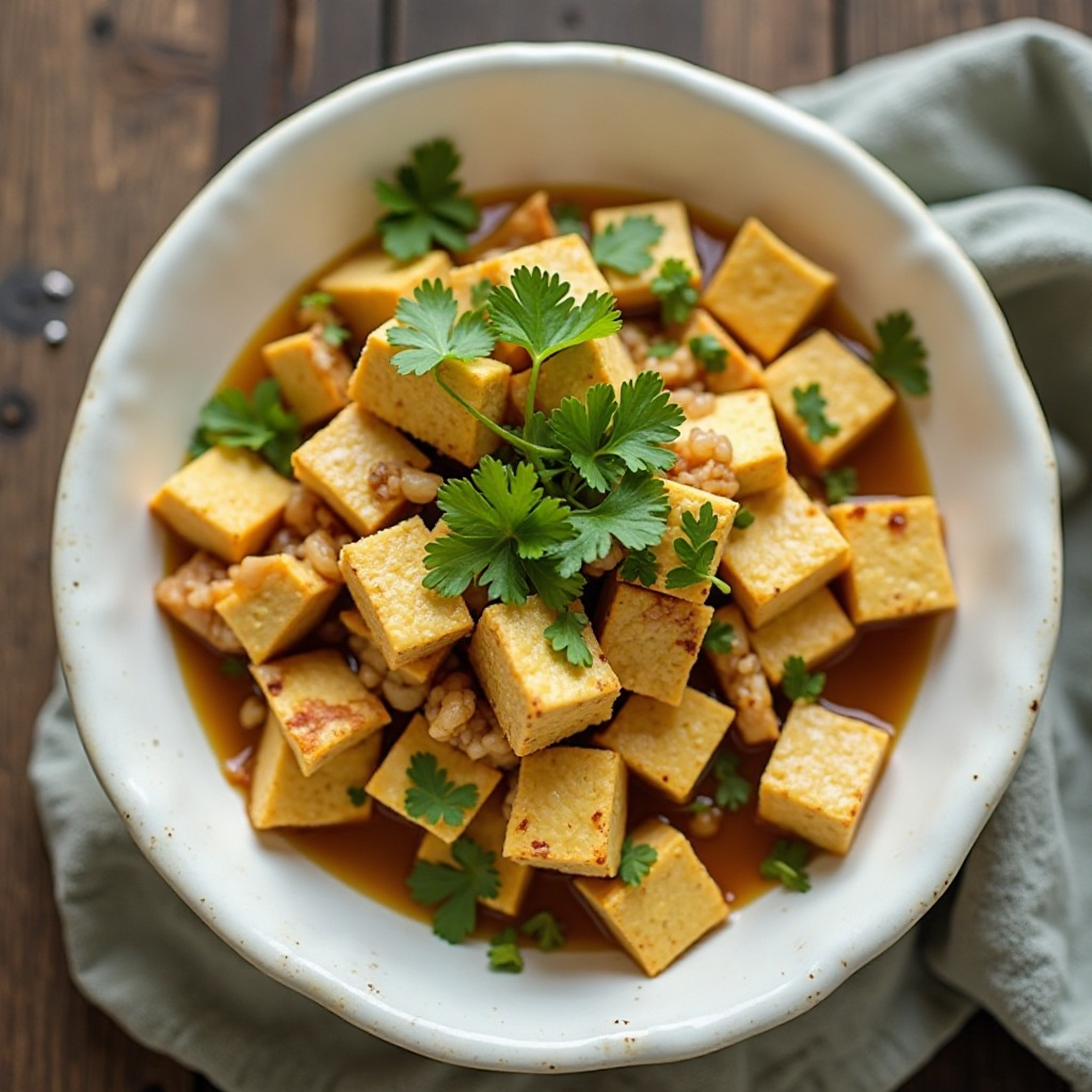El tofu es una excelente fuente de proteínas vegetales y bajo en grasas, mientras que el taro ofrece vitaminas B y minerales como potasio. Juntos, estos ingredientes contribuyen a una dieta equilibrada. Este plato puede disfrutarse por su textura suave y sabores ligeramente picantes del jengibre, ideales para quienes buscan opciones saludables y sabrosas.