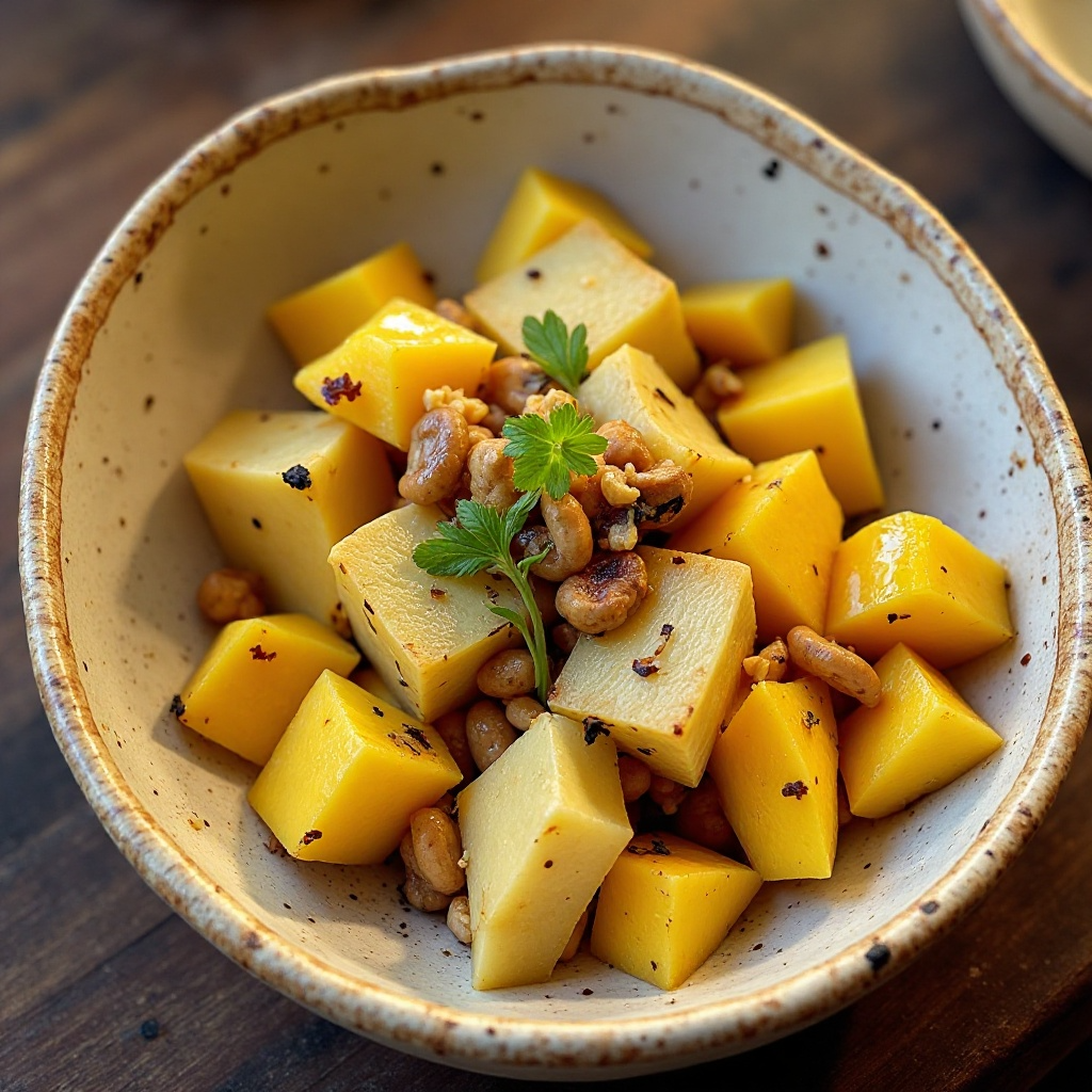 - Coloca los cubos de mango sobre los taros cocidos, salpimienta al gusto y mezcla delicadamente para distribuir el sabor. Sirve caliente o frío, según prefieras.