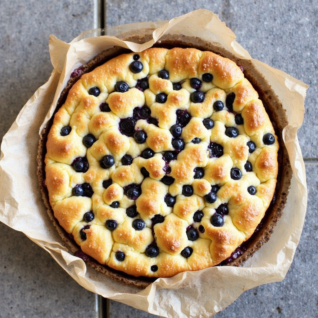 - Distribuye los arándanos sobre la masa de la tarta, regándolos con miel de abeja y horneándolos durante 35-40 minutos, o hasta que la tarta esté dorada y el centro esté firme al tocarlo.