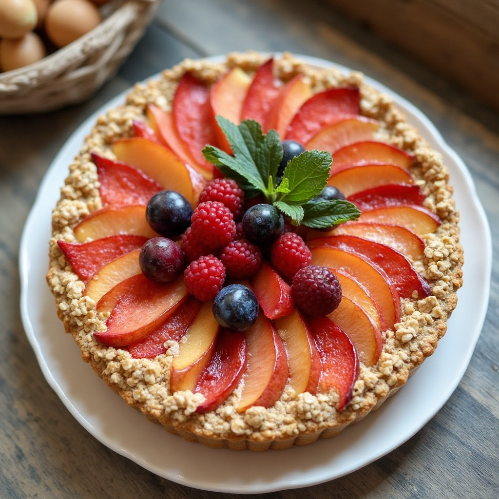 Esta tarta es rica en fibra gracias a las frutas frescas y la avena integral, contribuyendo a una dieta saludable. La miel de abeja agrega un toque dulce natural, mientras que los frutos secos y frutas ofrecen antioxidantes y nutrientes esenciales.